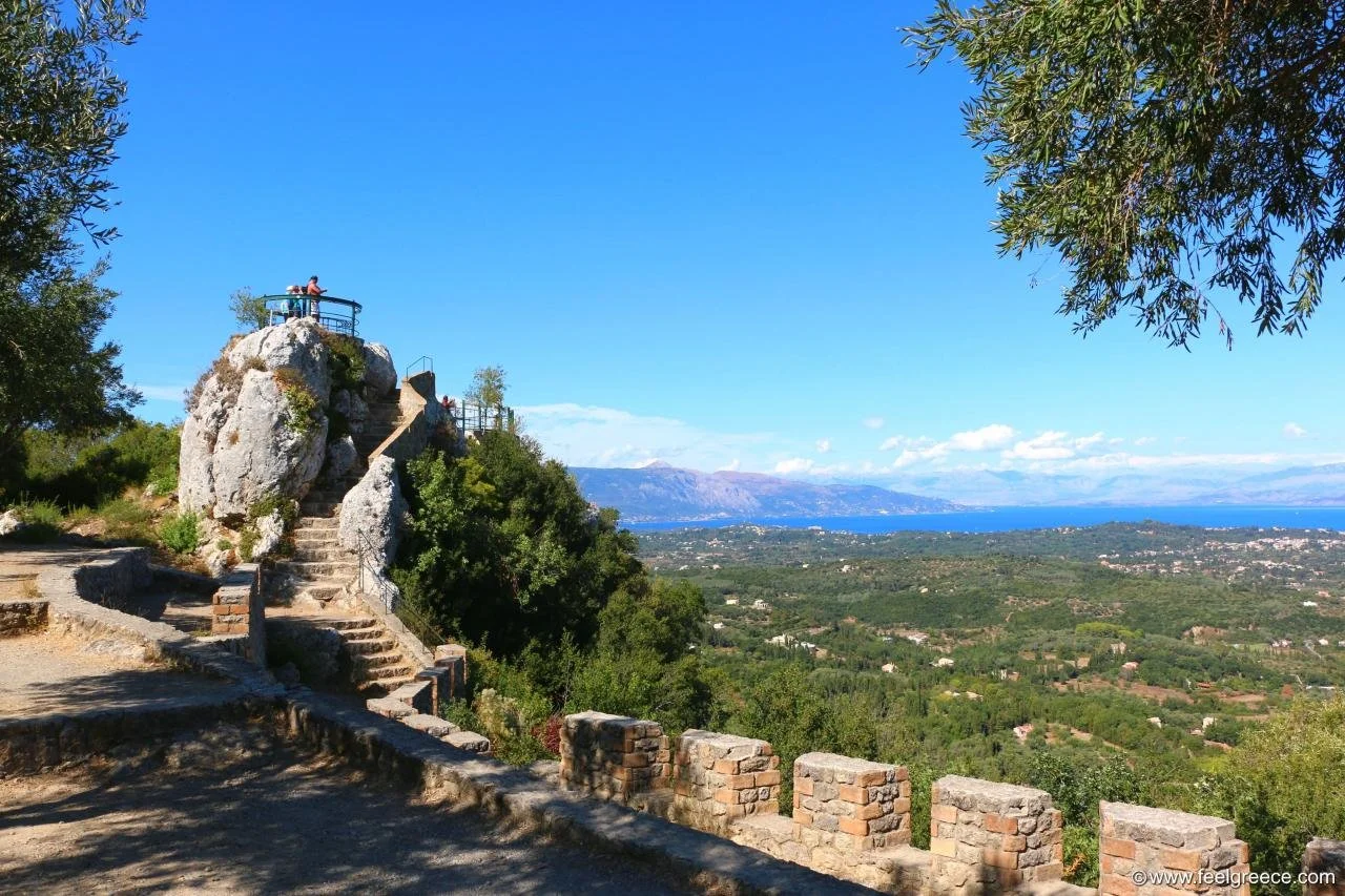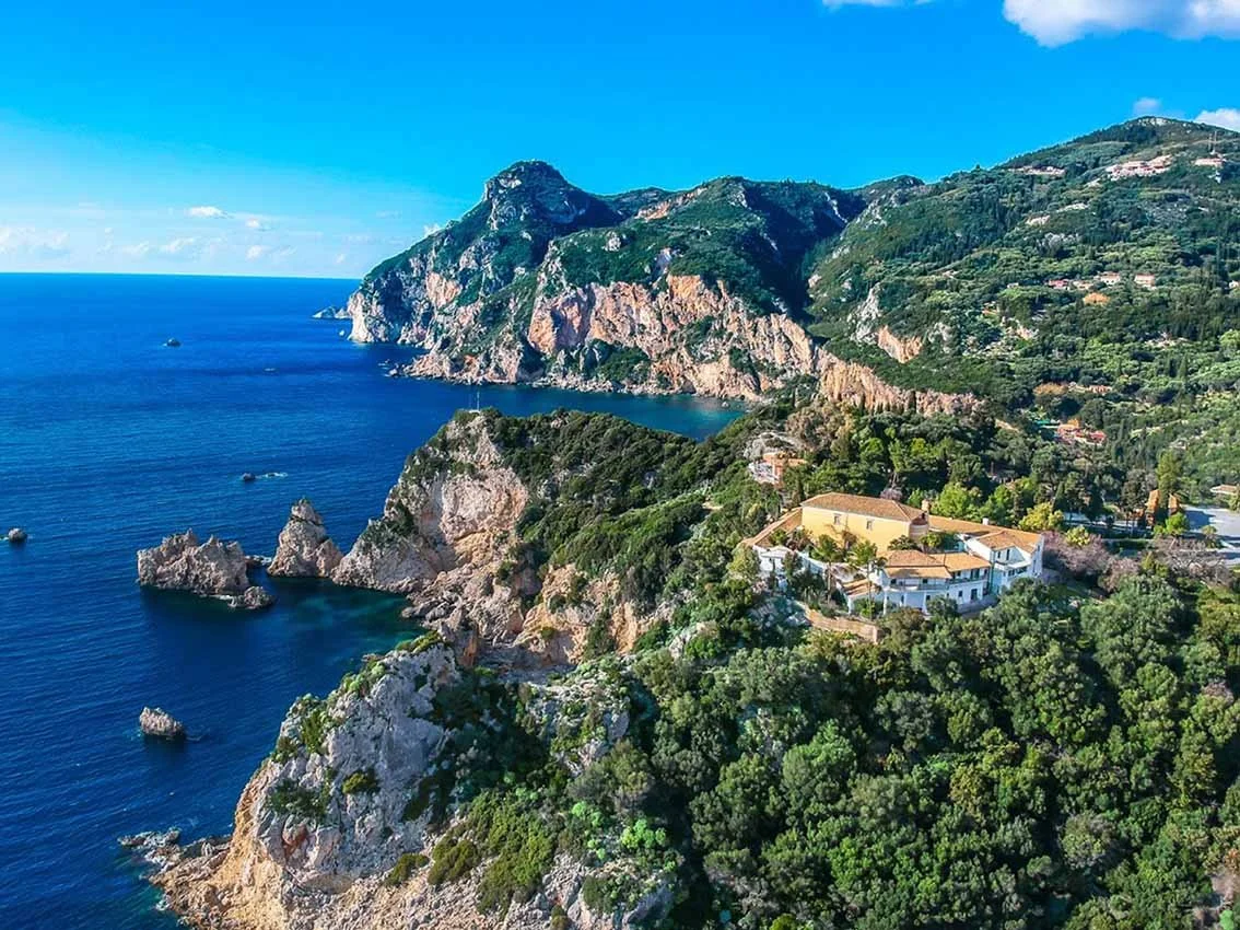 The island's landscape is characterized by olive groves, cypress trees, and a variety of Mediterranean flora. Mount Pantokrator, the highest peak on the island, offers panoramic views of the surrounding areas.