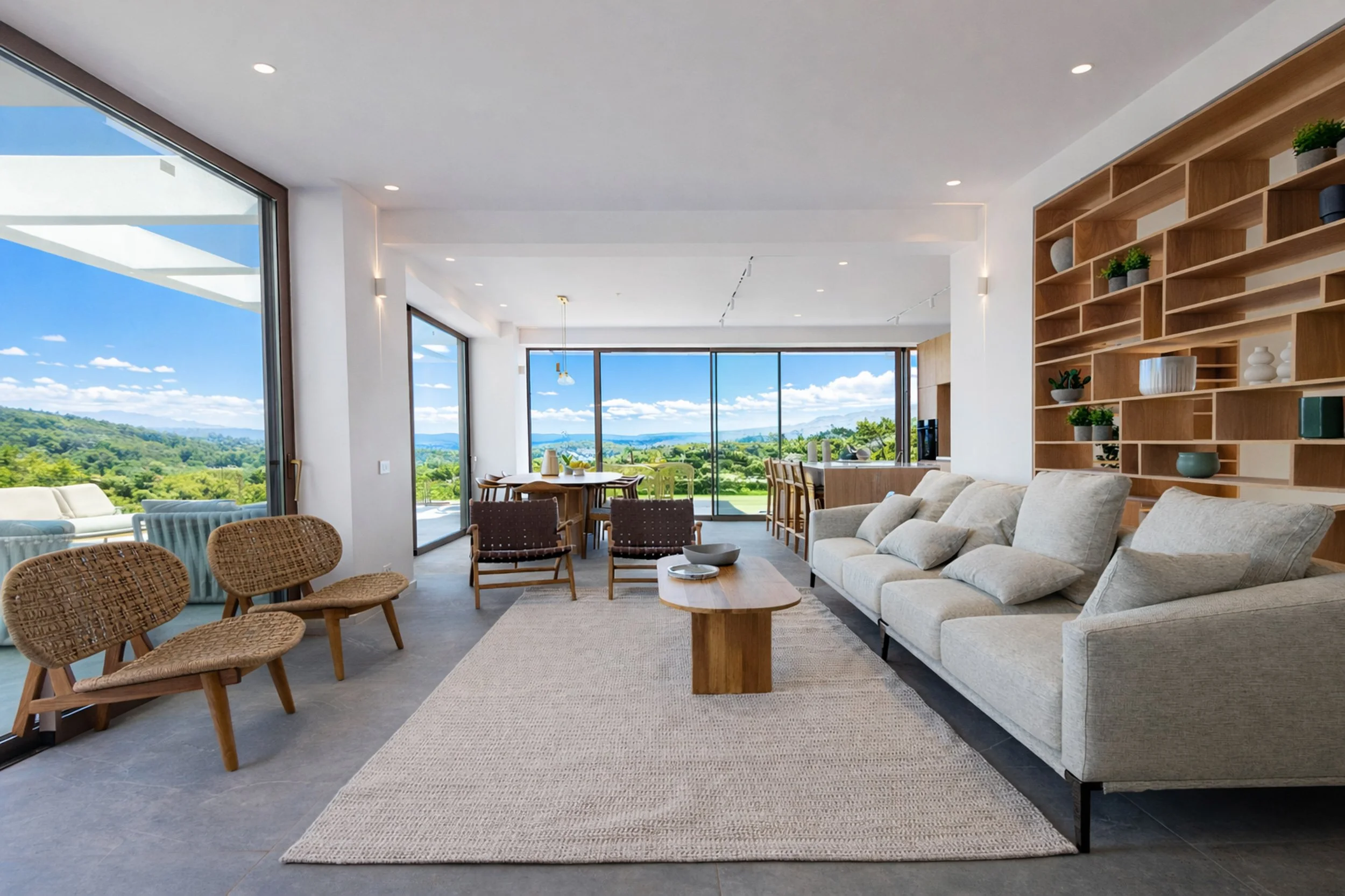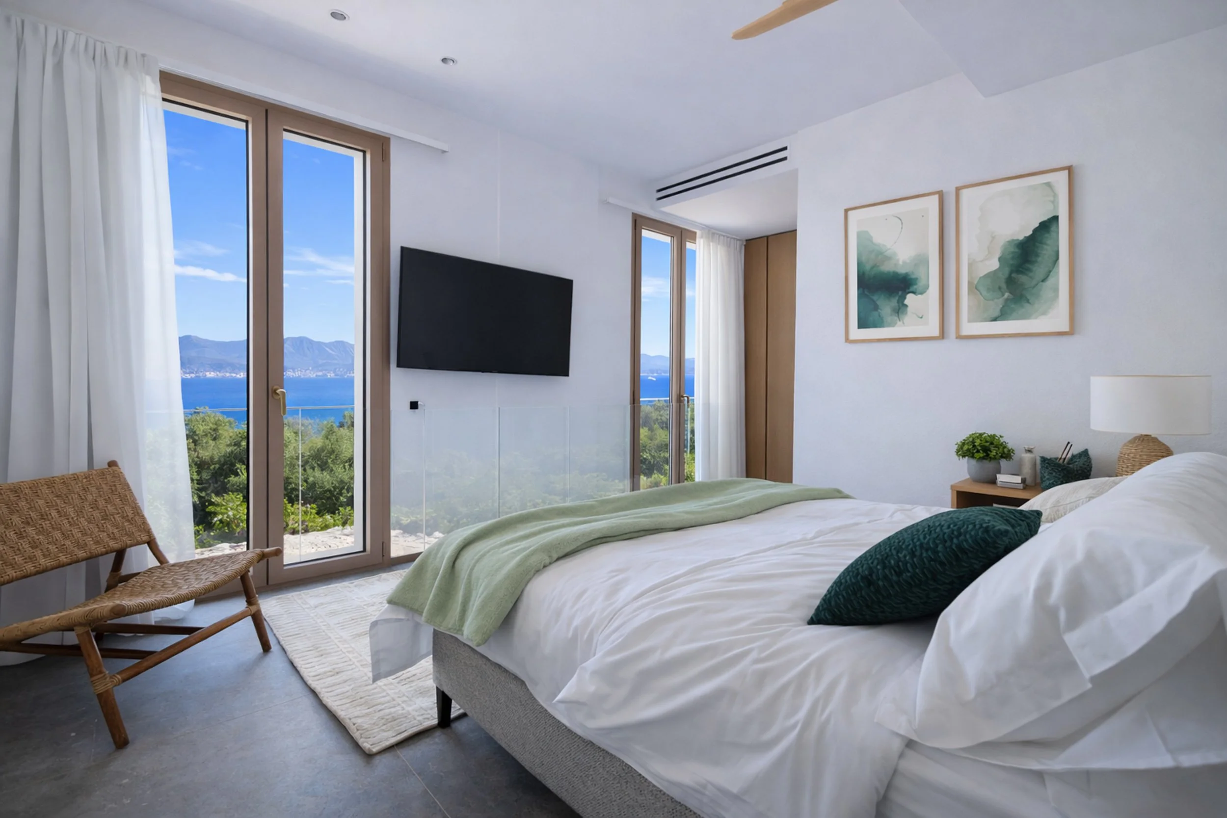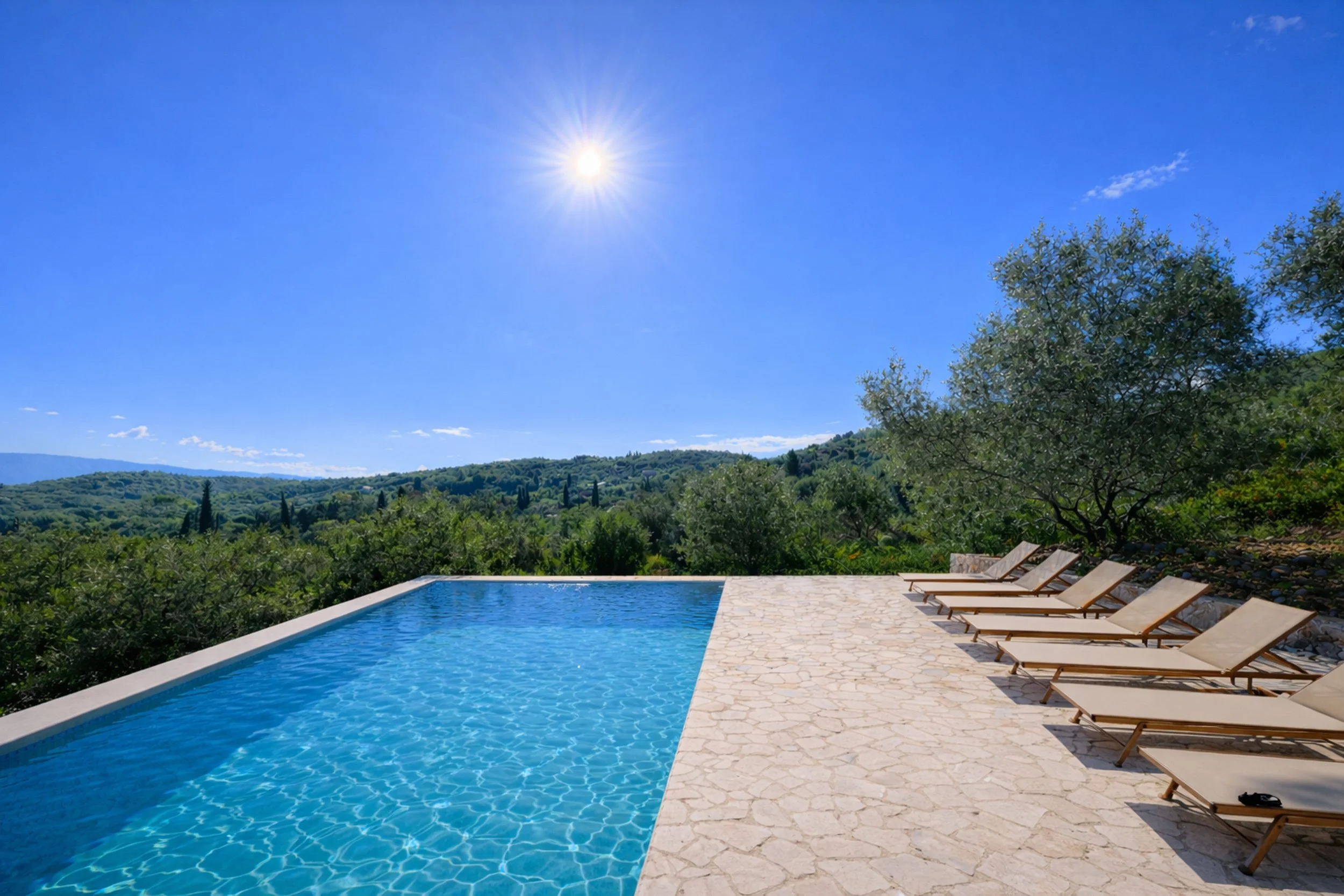 Perched high above Kassiopi, Villa Nessya enjoys breathtaking panoramic views across the Ionian Sea to the Albanian mountains, with expansive glass and sliding doors flooding the interiors with light and framing the ever-changing scenery. The villa’s open-plan living space blends a relaxed lounge with a contemporary kitchen and dining area, flowing seamlessly onto generous terraces with a jacuzzi, shaded seating, and an outdoor cooking and dining area ideal for long sunset evenings, while a quiet reading corner offers a peaceful retreat in the garden. Just above, the private pool sits in an elevated position with its own bar and facilities, overlooking the rolling hills. With eight beautifully arranged bedrooms accommodating up to 18 guests, including luxurious suites with jacuzzi baths, Villa Nessya is perfectly suited to large families or groups, further enhanced by a cinema room, gym, massage room, and additional kitchen. Combining privacy with convenience, the villa is just a short distance from Kassiopi’s vibrant centre and nearby beaches, making it an exceptional base for exploring Corfu’s north-east coast.